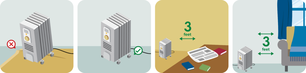 Space heaters need at least three feet of space between the heater and combustibles like drapes, furniture, and beds. Also, make sure small children cannot get near space heaters and suffer contact burns from touching them. As with any electrical appliance, check the cord to make sure it is not frayed or worn. Extension cords should not be used with electric space heaters. Electric space heaters also are dangerous in the bathroom because of cramped space and radiated heat as well as the danger of electrical appliances and water. Never touch an electric space heater if your hands are wet or if you are in contact with water. Never leave a space heater on when you go to bed or leave the house.