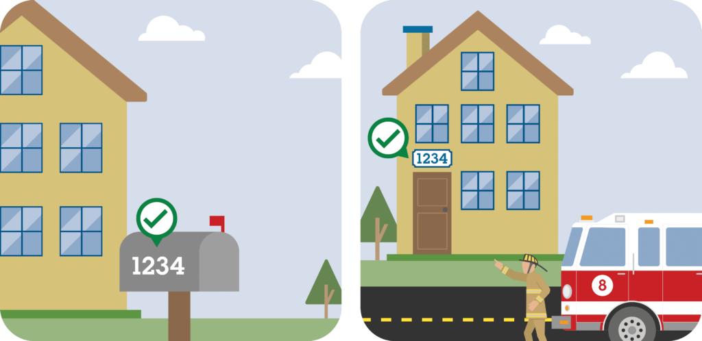 - Make sure your address is visible using a minimum of 4” block numbers. The bigger the numbers, the easier it is to see them from the road.